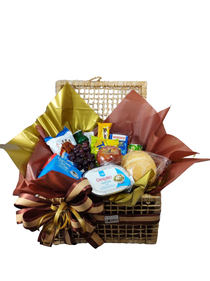 Baú Decorado de 40x32x23 recheado com delícias! Inclui 01 xícara com pires de 90ml, 01 suco 200ml, 01 achocolatado 200ml, 01 iogurte 200ml, 01 sachê de chá, 01 cápsula de café, 02 sachês de adoçante e 02 de açúcar. Para os aperitivos, temos 01 salgadinho Torcida 45g, 02 Club Social 24g, 01 Polenguinho 17g, 01 pão de mel Bauducco, 01 barra de cereal 20g, 01 cookies Bauducco 40g, 01 barra de biscoito com recheio 25g, 01 torrada Marilan ou Bauducco 15g, 01 bolinho Bauducco 40g, 01 bombom 20g, 01 geleia 15g, 01 biscoito wafer com recheio 48g, 01 sucrilhos 25g, 01 biscoito BelVita 25g, 01 fruta de época e 03 pães. Acompanha uma rosa para presente!