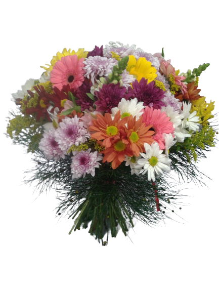 Lindo buquê contendo 18 flores, incluindo Margaridas e Gérberas, decoradas com folhagens exuberantes que trazem um toque de natureza para qualquer ambiente. Ideal para presentear ou decorar sua casa!