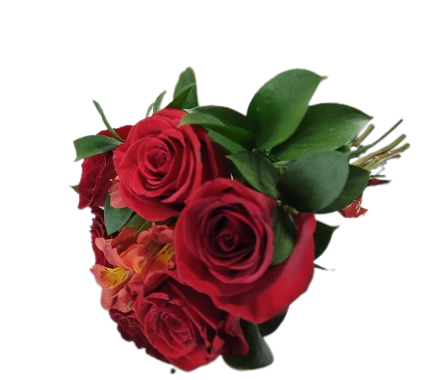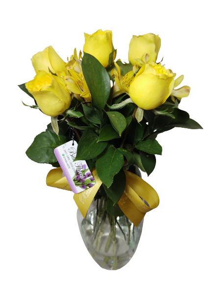 Arranjo de flores com 6 Rosas em várias cores (branca, azul, vermelha, amarela, rosa, pink, lilás e laranja), 2 astromélias e folhagens em um jarro de vidro.