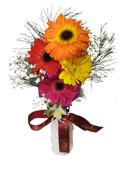 Obs: A disposição e as cores das gerbéras podem variar conforme a disponibilidade local, mas a qualidade e a beleza estão sempre garantidas.