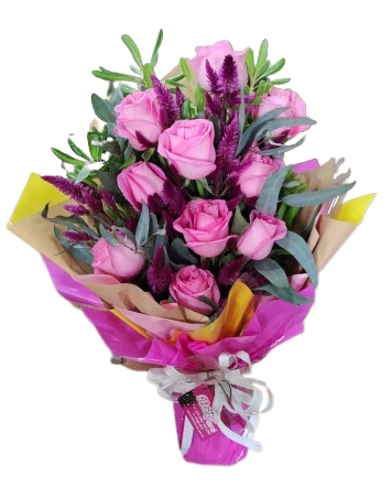 10 Rosas nacionais (pink) com um toque especial de Sempre Viva, tudo embrulhado em papel celofane para deixar o seu presente ainda mais charmoso.
